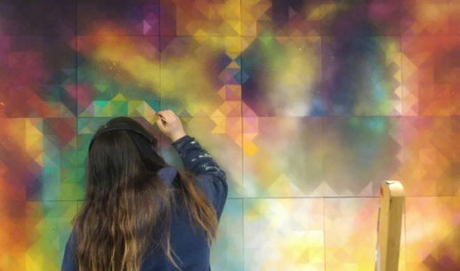We combined my slightly OCD geometric style with his loose and spontaneous methods to produce a mesmerising depiction of outer space. The paintings are made up of acrylic and spray paint to produce a unique style and wonderful effect.